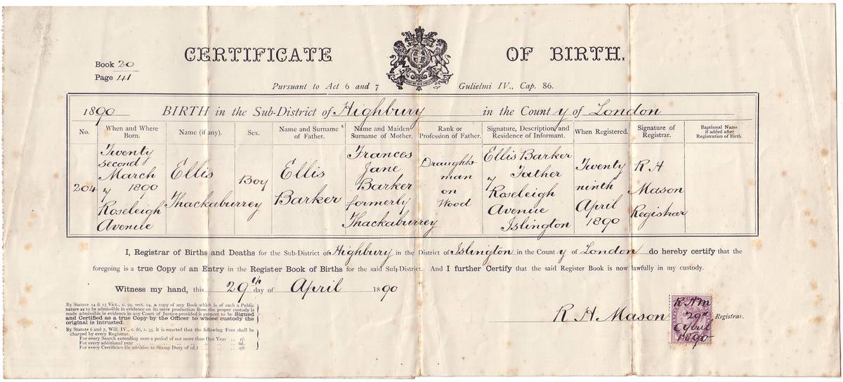 The cited information was sourced from Certificate published on April 29th, 1890 <\\Nasc68dc7\genealogy\Sources\Birth-Death-Marriage\BCellisthackaburreybarker.jpg> (Ref: Book 20, page 41) This citation is considered to be direct and primary evidence used, or by dominance of the evidence.